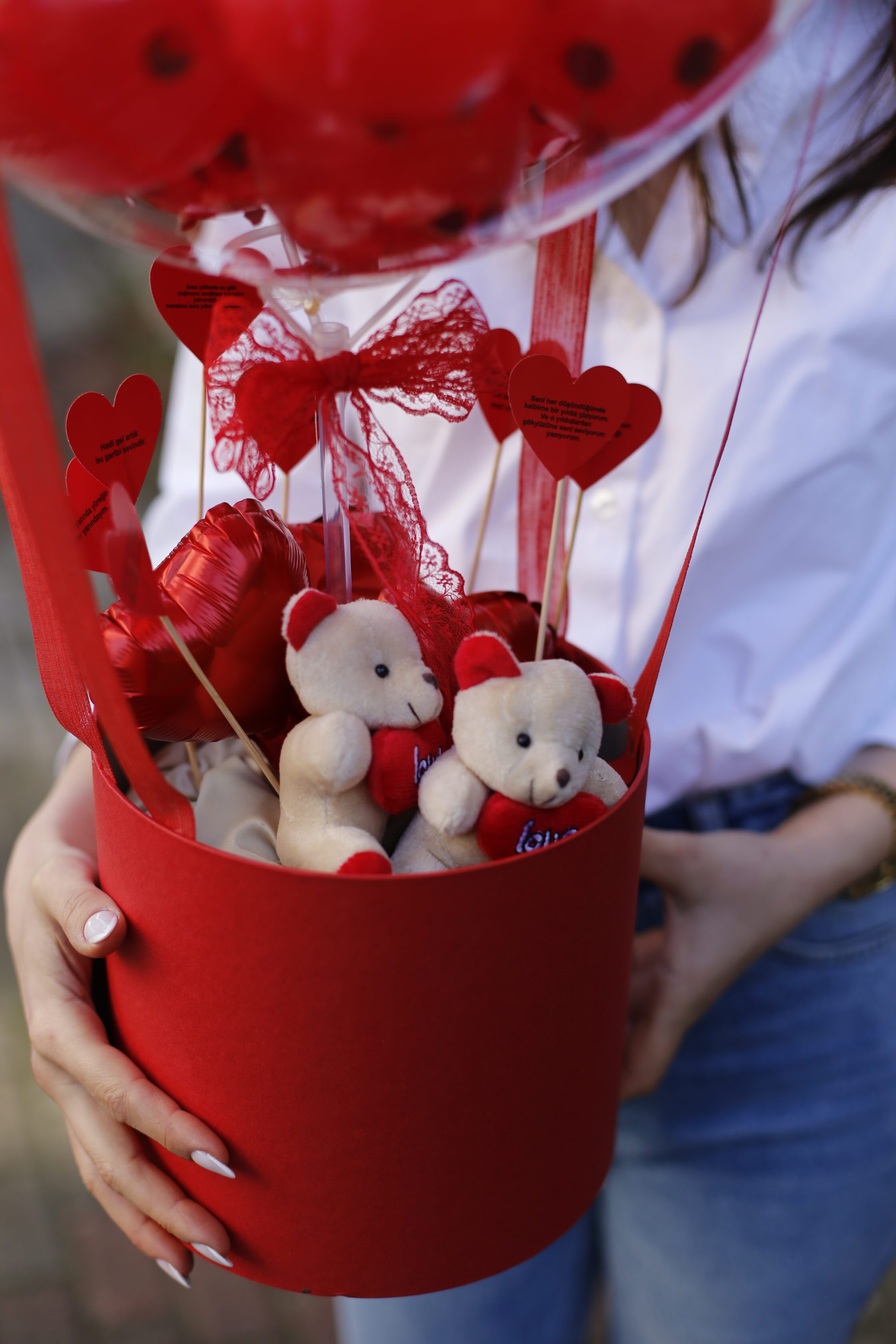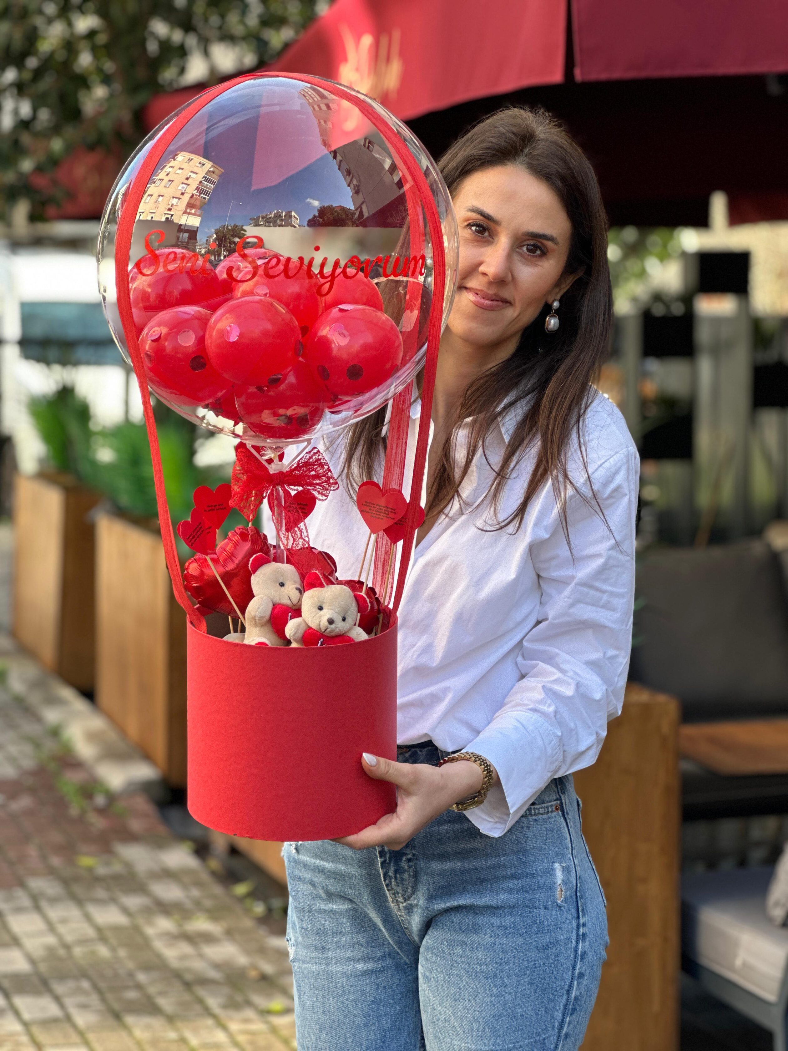 Ayıcıklı Bobo Balon Hediye Kutusu, şeffaf bobo balon içerisinde kırmızı balonlar, alt kısmında sevimli ayıcıklar ve romantik detaylarla hazırlanır. Kişiye özel yazı seçeneği sayesinde özel günler için anlamlı ve unutulmaz bir hediyedir.