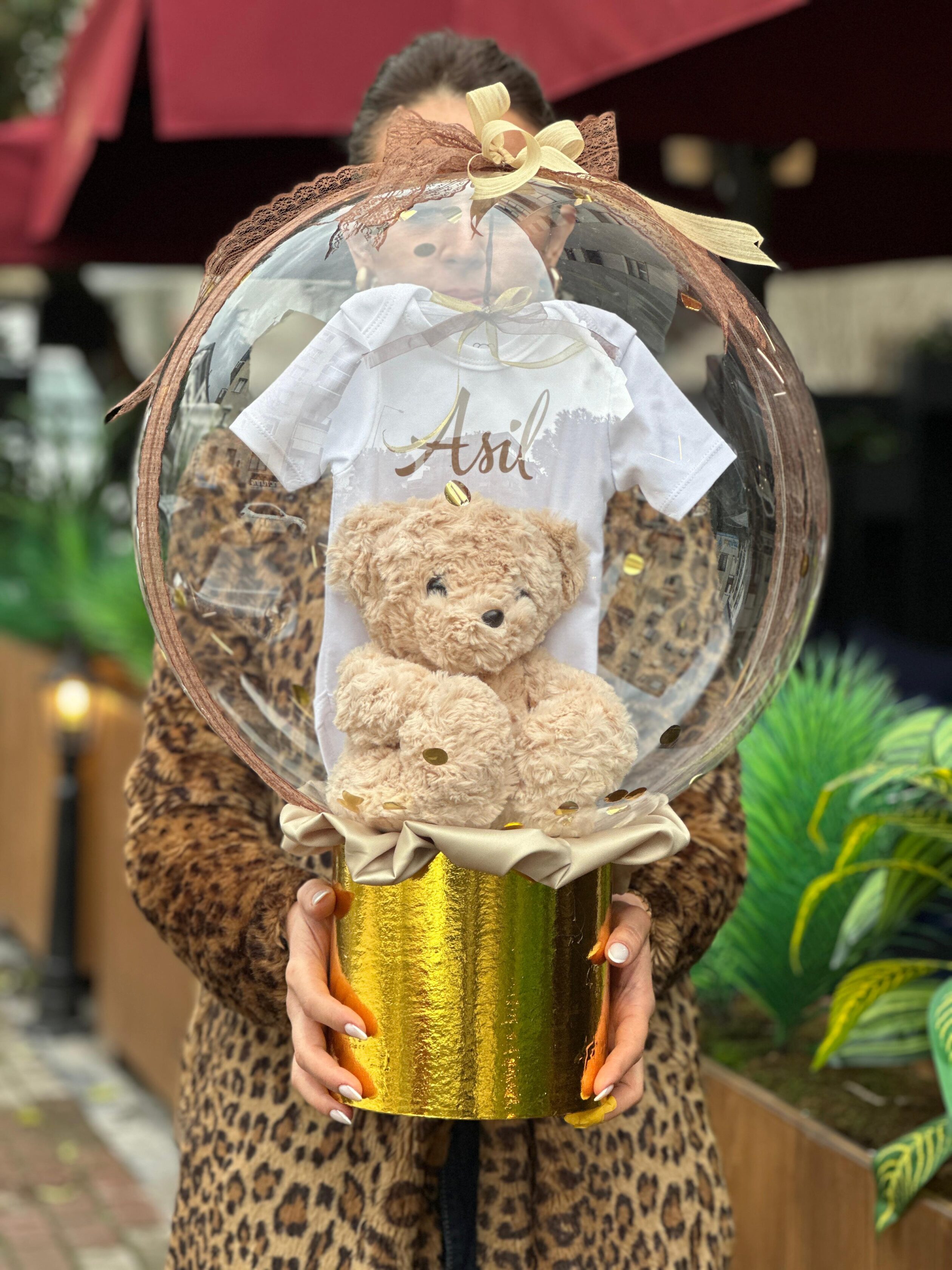 Cam fanus içerisinde sevimli ayıcık ve bebeğin ismine özel baskılı body yer alır. Gold kutu ve zarif süslemelerle tamamlanan bu özel tasarım, hem dekoratif hem de duygusal bir hediye alternatifidir.