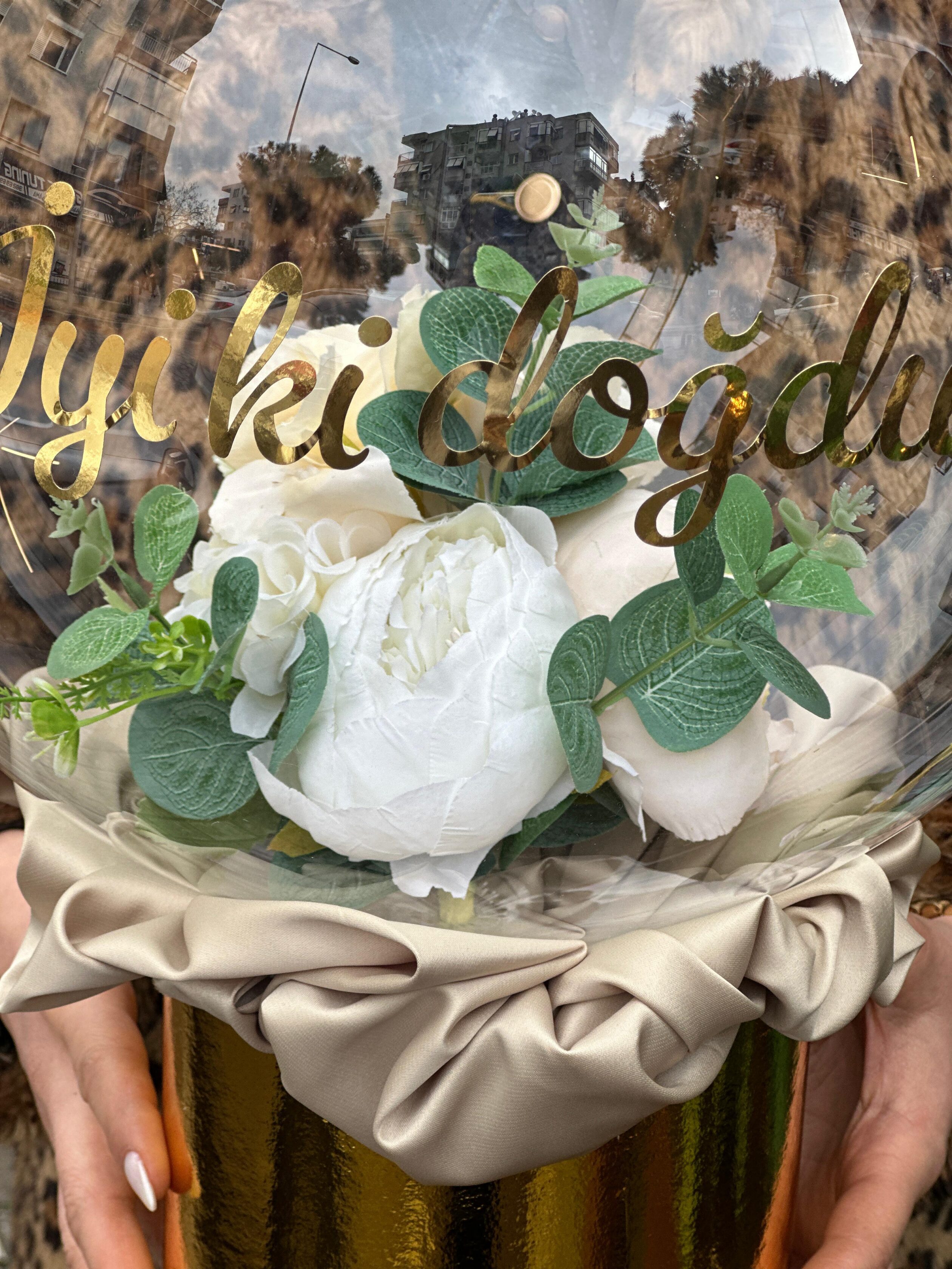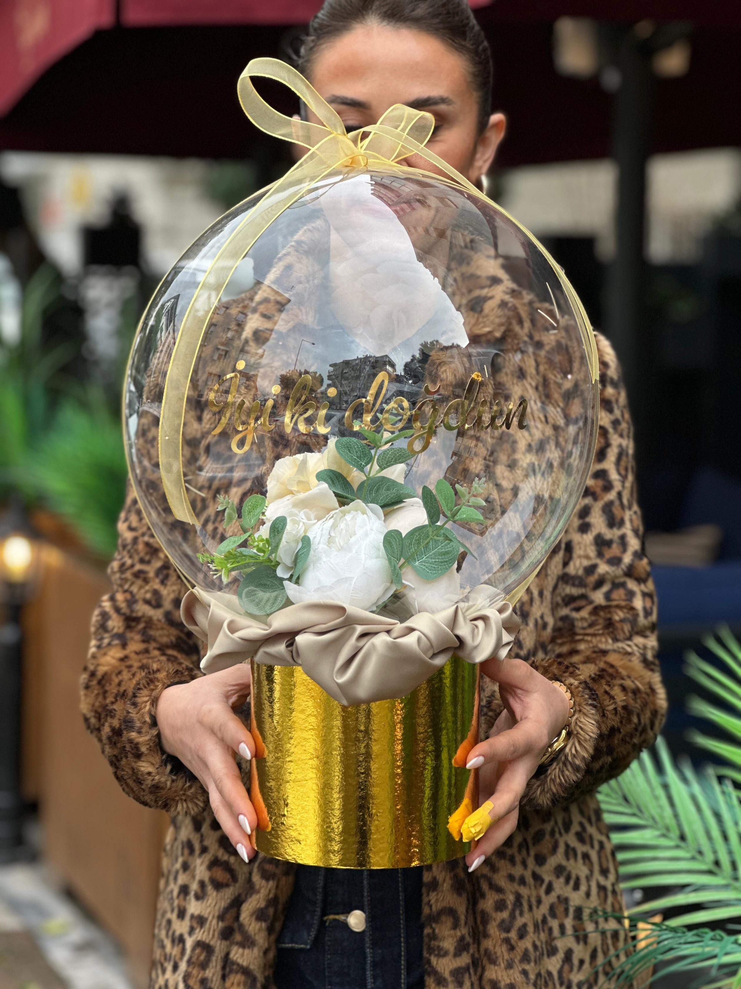 Şıklığı ve zarafeti bir araya getiren bu özel tasarım; yazılı cam (bubble) balon, zarif çiçek detayları ve gold silindir kutu ile hazırlanmıştır. Kişiye özel yazı seçeneği sayesinde sevdiklerinize unutulmaz ve anlamlı bir hediye sunar.
