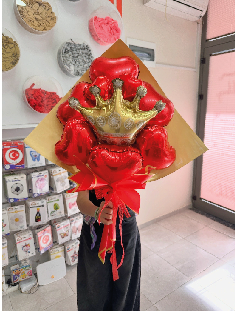 Göz alıcı kırmızı kalpler ve ihtişamlı kral tacı detayının buluştuğu bu özel folyo balon buketi, kutlamalarınıza şık ve romantik bir hava katar. Doğum günü, sevgililer günü, yıl dönümü ya da özel sürprizler için mükemmel bir hediye alternatifidir.