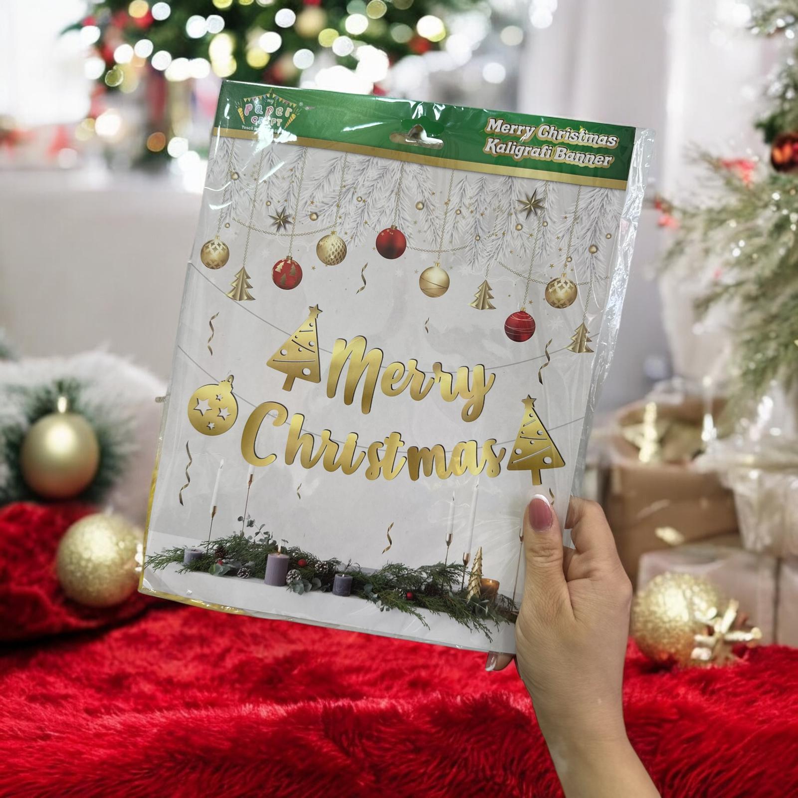Paketin İçerisinden İyi kalite Merry Christmas yazılı Gold kagit ve yanında bir adet kurdele çıkmaktadır.