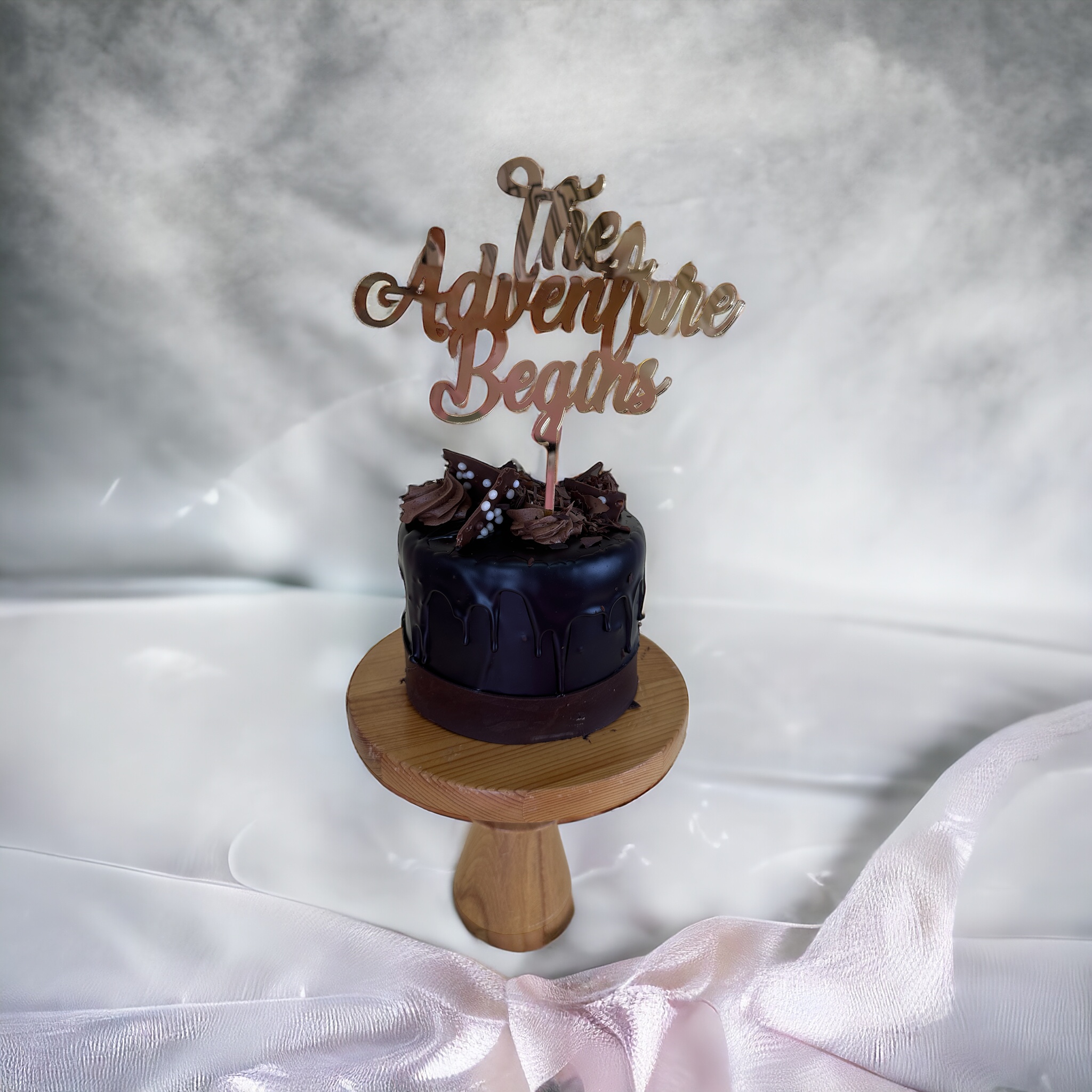 Paket içerisinde 1 adet Pasta üstü pleksi balonlu Then Adventure Begins Yazılı Gold topper bulunur.